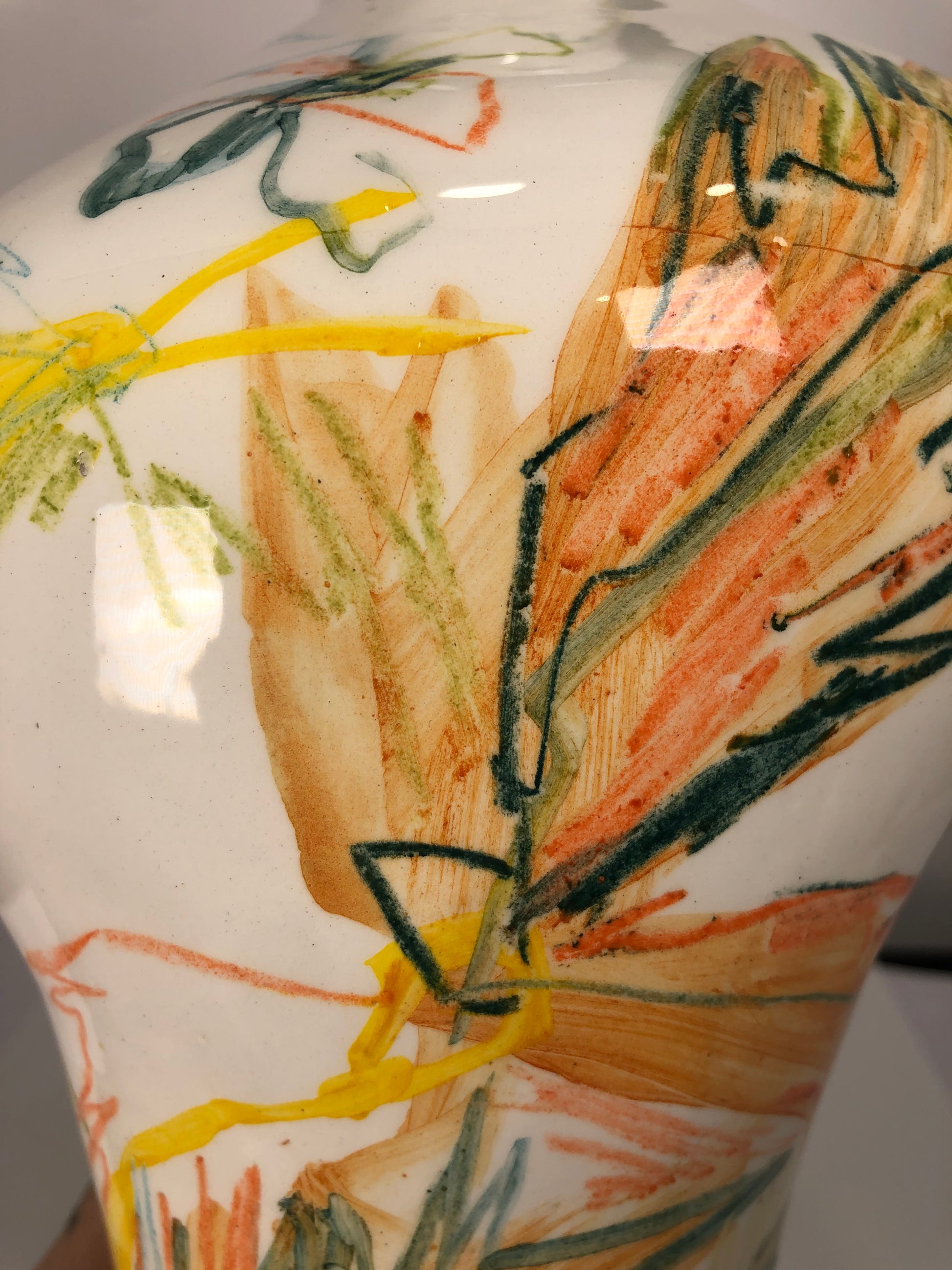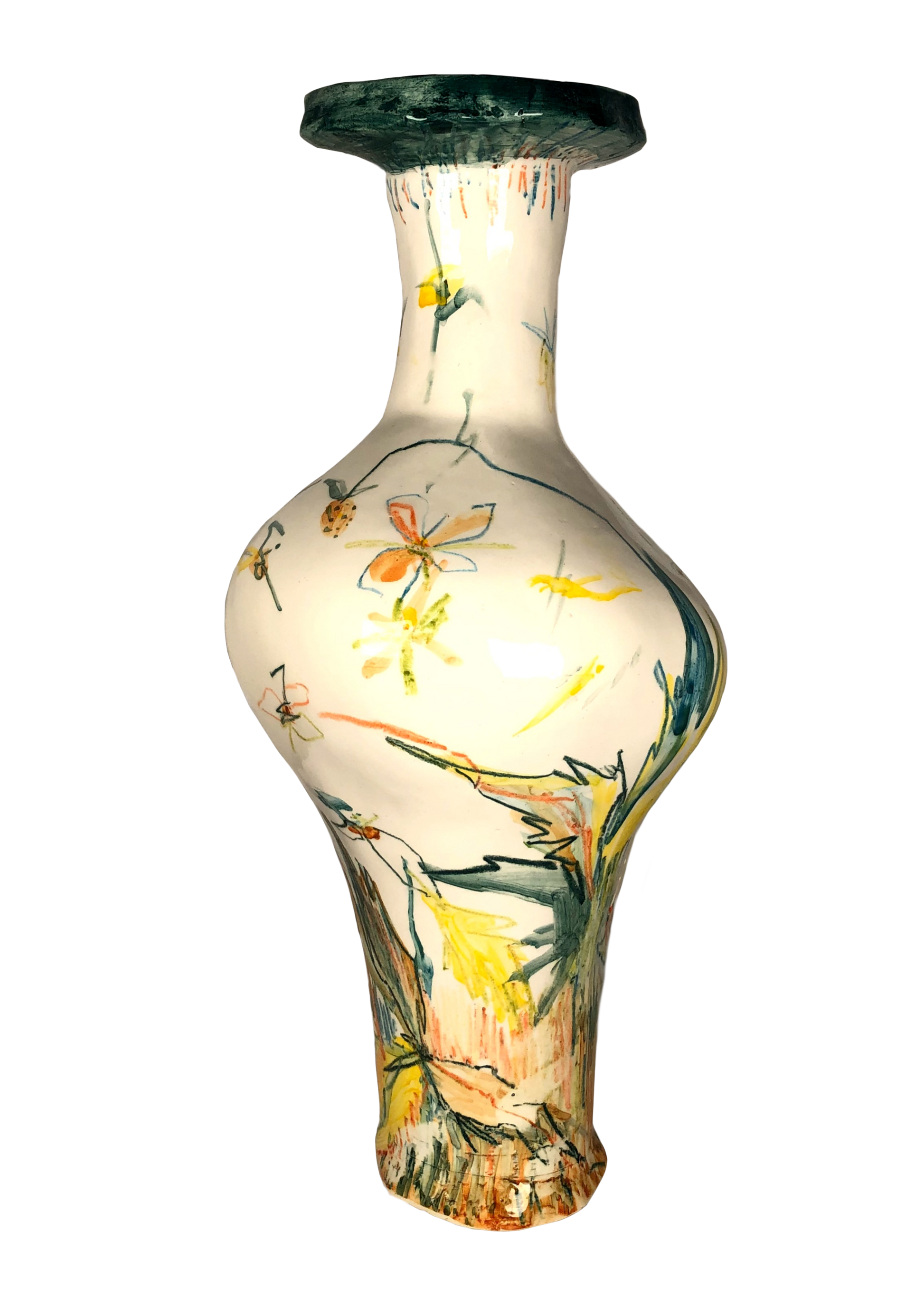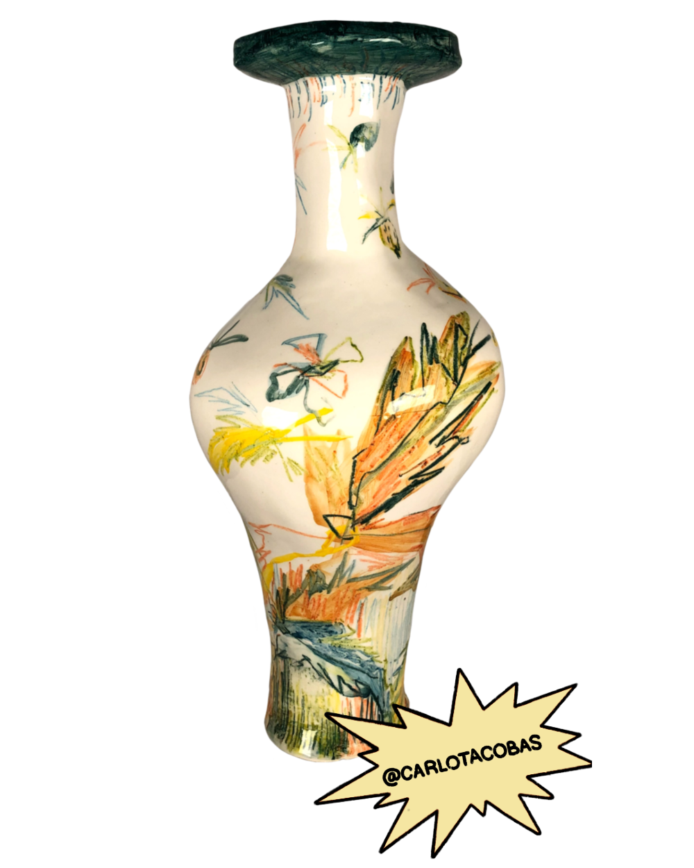 Caflora nos envía este jarrón hecho y pintado a mano. Esta obra mide 19x37cm. Tiene un precio de 350€.