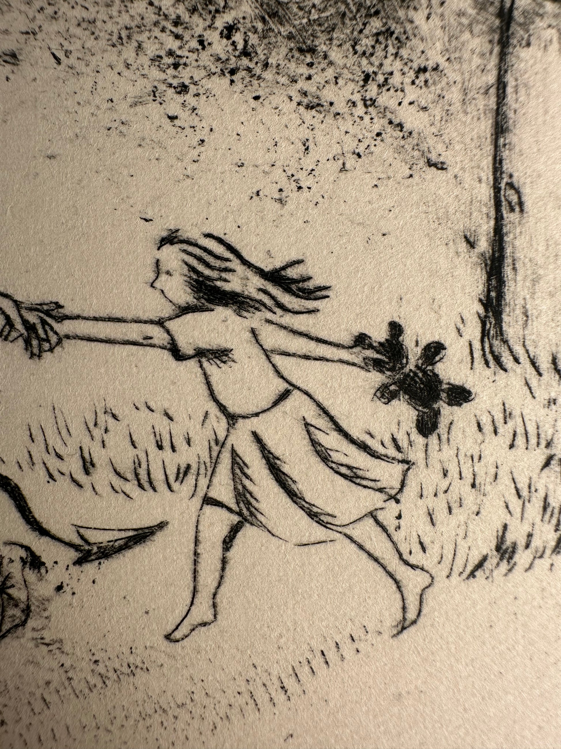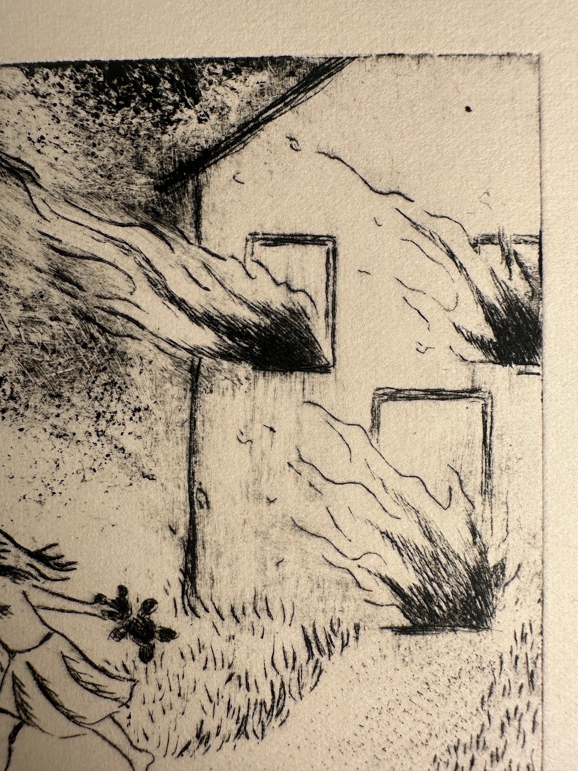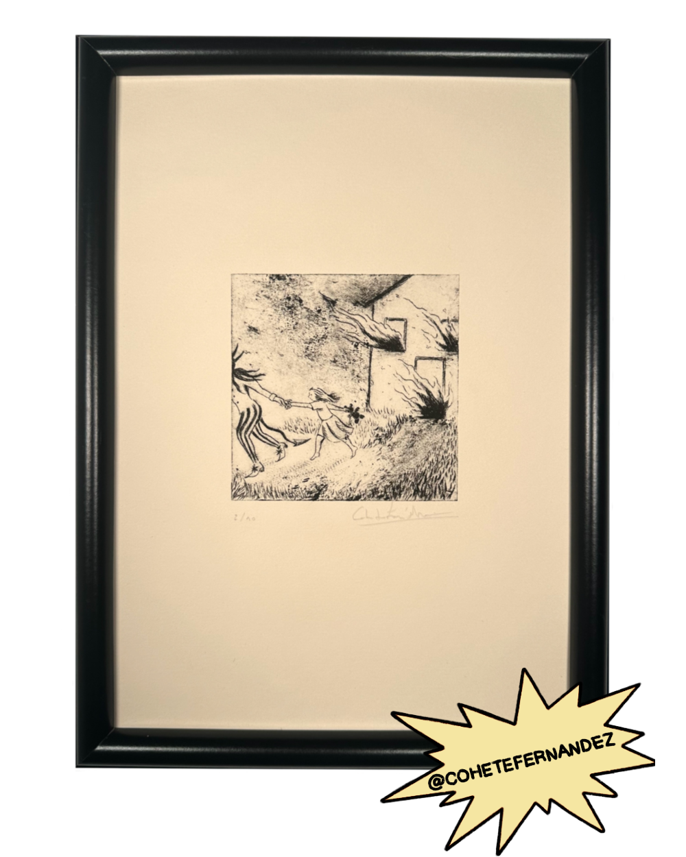 Alejandra nos envía esta lámina a punta seca, tinta calcográfica sobre papel rosa espina, 21x30cm. Tiene un precio de 50€.