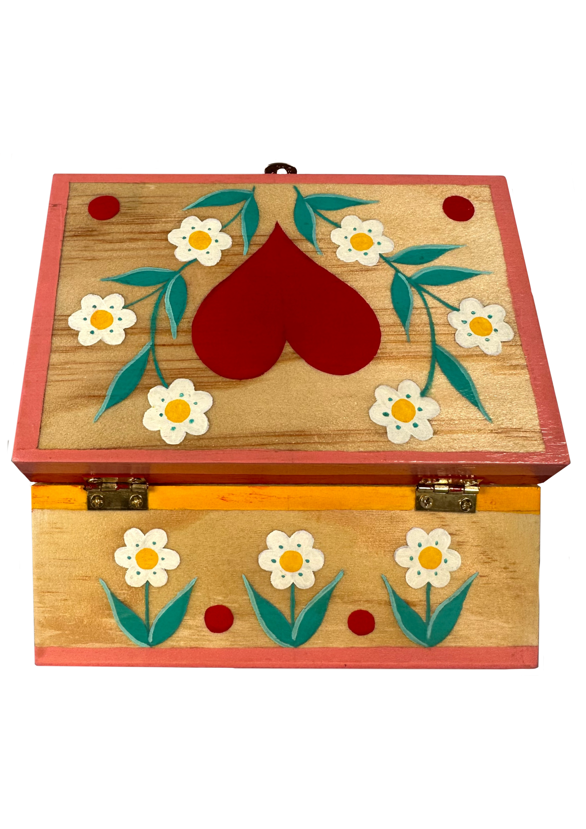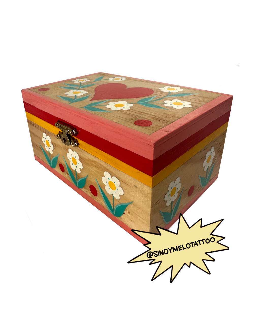 Sindy nos envía esta cajita de madera pintada a mano. Esta obra mide 10cm de fondo, 15cm de ancho y 7,5cm de alto. Tiene un precio de 60€.